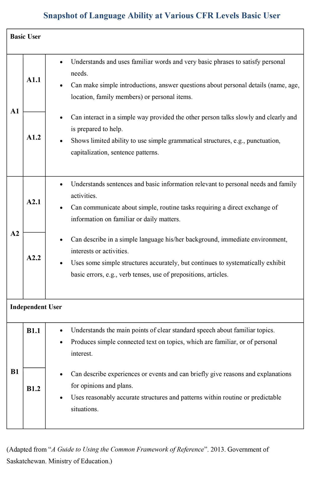 The CFR contains six levels, ranging from the beginner level (A1) to the highest level of language proficiency (C2). For the purposes of EAL support in Saskatchewan schools, the focus for learners is on the first three levels of the CFR scale (A1, A2, and B1), which are further divided into A1.1, A1.2, A2.1, A2.2, B1.1, and B1.2. A learner who has moved beyond B1.2 has developed a level of proficiency that is comparable to that of English first language peers, allowing the learner to work more independently on improving language proficiency.